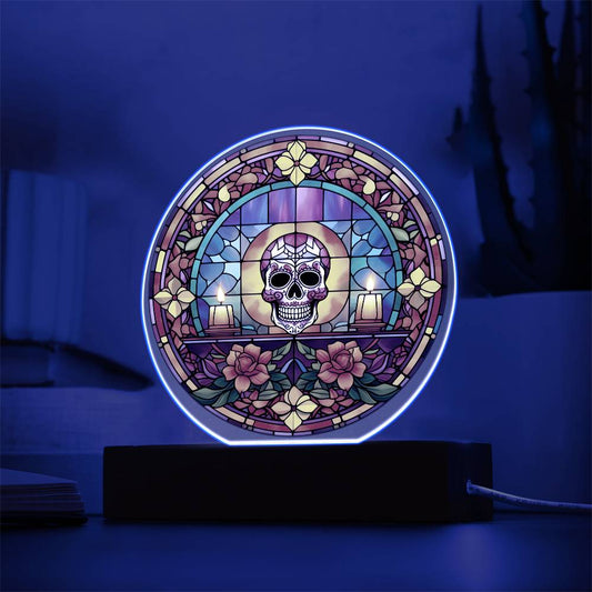 Stained Glass Day of the Dead Sugar Skull - Acrylic Circle Plaque LED Light - Dia De Los Muertos - Day of the Dead Gift - Mexican Skull