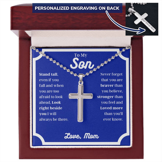 Mom - To My Son - Stand Tall - Personalized Cross Necklace with Military Style Ball Chain -Son Gift - Birthday - Father's Day Gift from Mom - Grad Gift - Holiday Gift