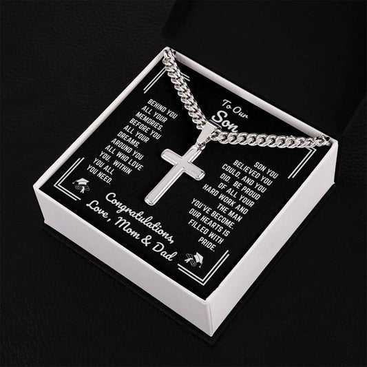 Mom & Dad - To Our Son - Graduation - Personalized Cross Necklace with Cuban Link Chain - Graduation Gift - Gift from Mom & Dad
